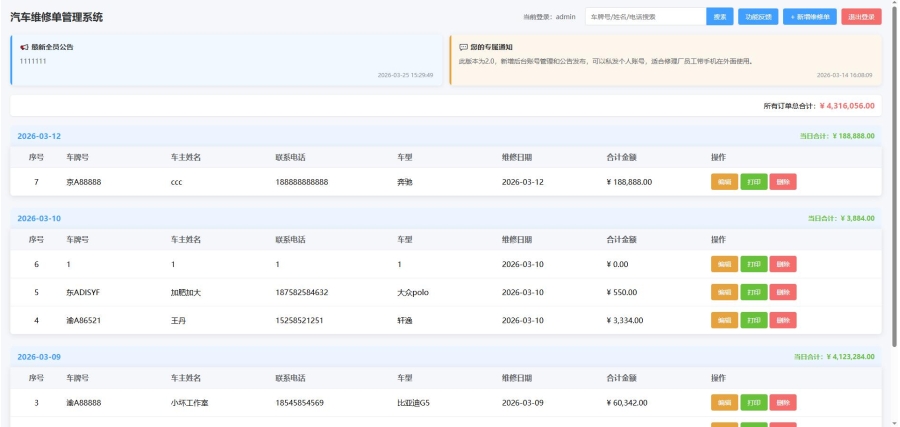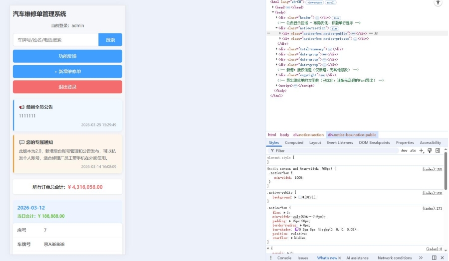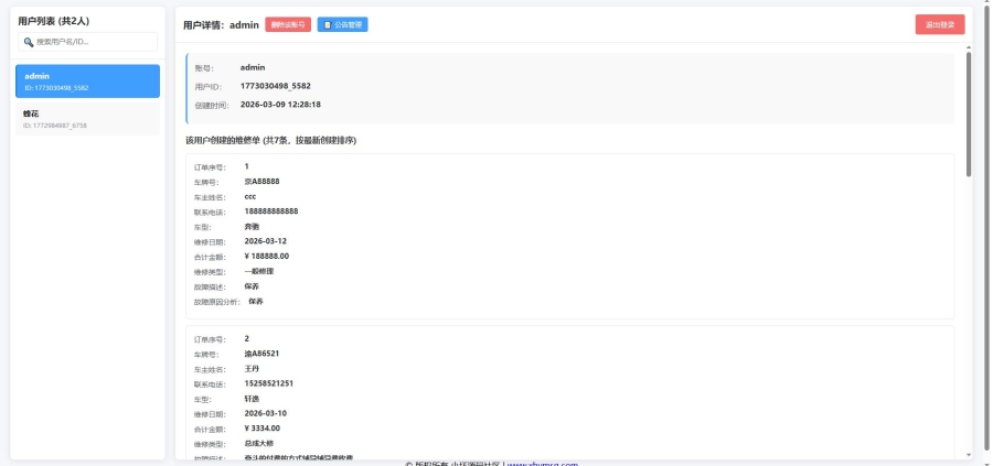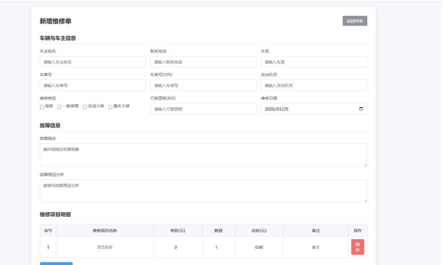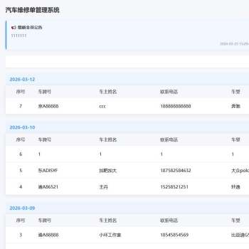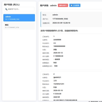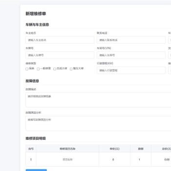 汽修单管理系统源码,专为中小汽修门店打造的轻量化管理工具。它能帮你高效管理维修订单和客户信息,从车辆信息录入到故障分析、费用统计,全程数字化流转,告别纸质单据和混乱台账。 系统界面简洁直观,操作零门槛,同时支持按用户、按日期精准查询,让每一笔维修记录都清晰可追溯,全面提升门店运营效率与客户服务体验。